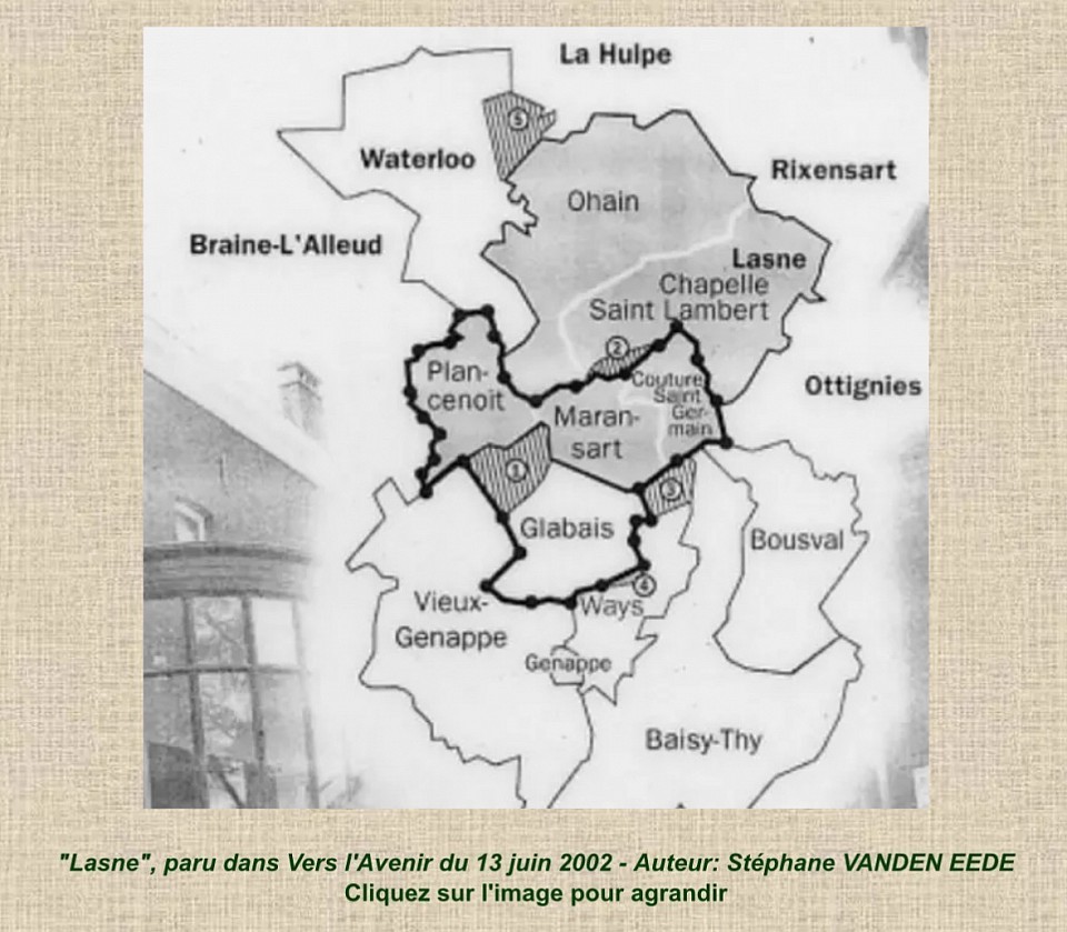 1. Que « Les communes plutôt rurales d’Ohain (limitrophe de Waterloo, au sud-est), de Lasne-Chapelle-Saint-Lambert (au sud-est d’Ohain) et d’Ophain-Bois-Seigneur-Isaac (limitrophe de Braine-l’Alleud, au sud-ouest) auraient dû rejoindre l’entité de Waterloo, dont le périmètre aurait dû s’éloigner en maints endroits des limites communales actuelles »